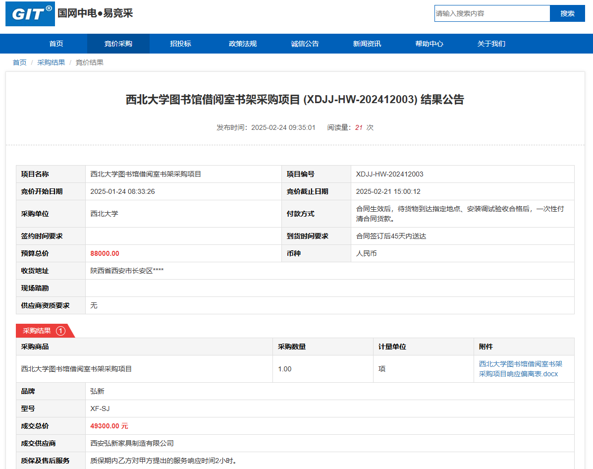 8868体育登录图书馆借阅室书架采购项目(XDJJ-HW-202412003)竞价结果公告 作者:采购与招标办公室 编辑: 时间:2025-02-24 原公告链接:https://www.ejingcai.com.cn/site/bidding/detail/16596