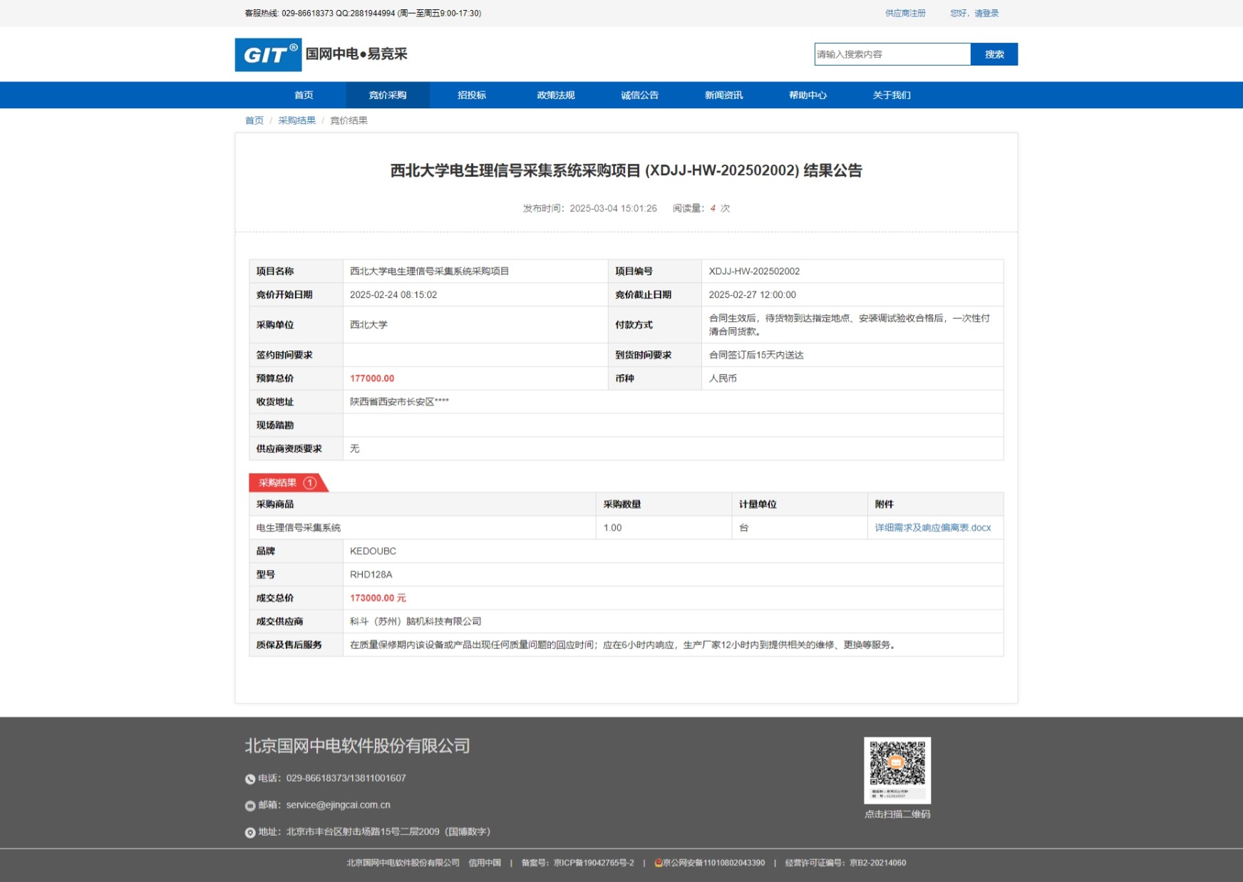 8868体育登录电生理信号采集系统采购项目 (XDJJ-HW-202502002) 竞价结果公告 作者: 编辑:采购与招标办公室 时间:2025-03-04 原公告链接:https://www.ejingcai.com.cn/site/bidding/detail/16713