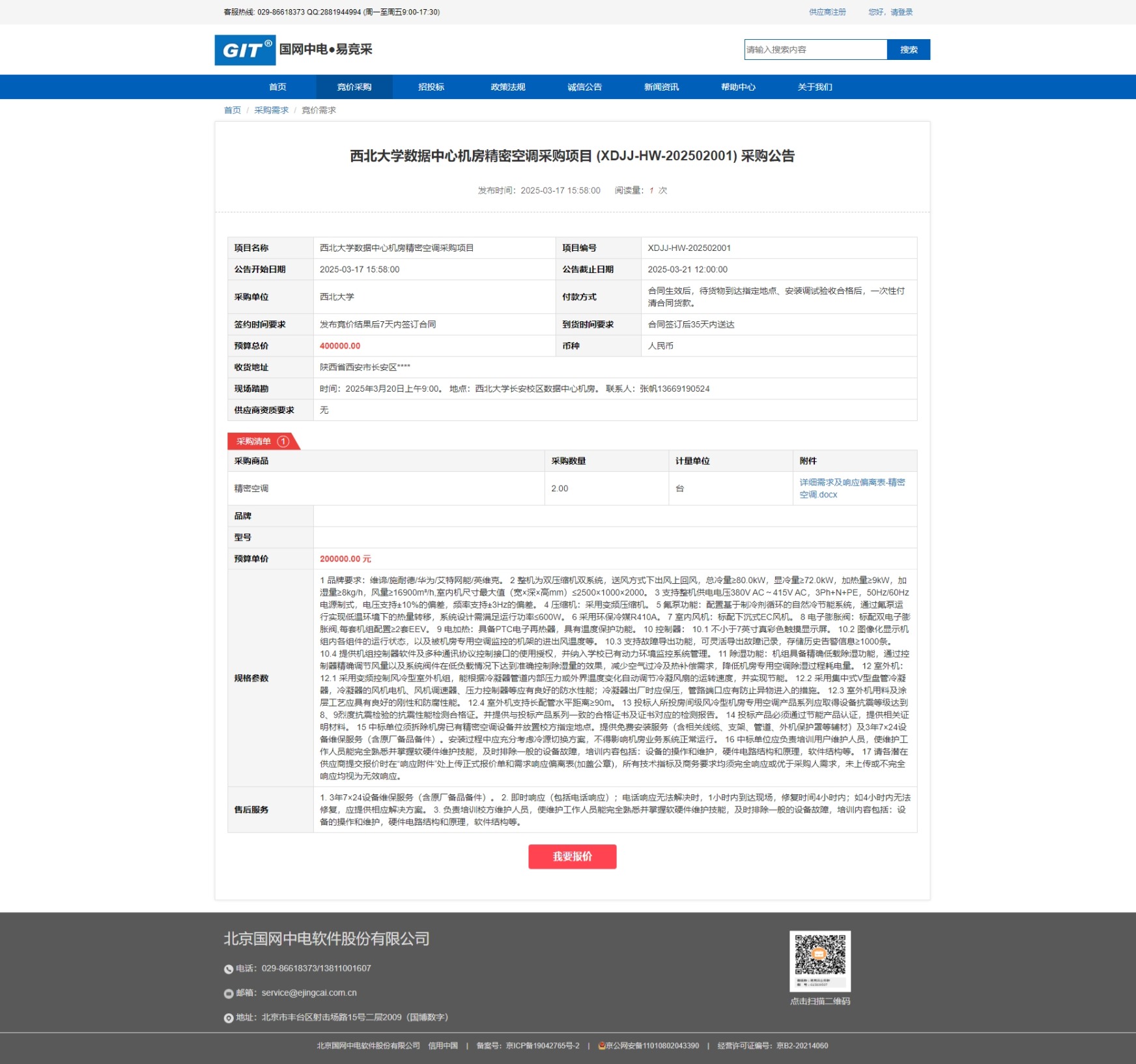 8868体育登录数据中心机房精密空调采购项目 (XDJJ-HW-202502001)网上竞价采购公告 作者: 编辑:采购与招标办公室 时间:2025-03-17 原公告链接:https://www.ejingcai.com.cn/site/bidding/detail/16997