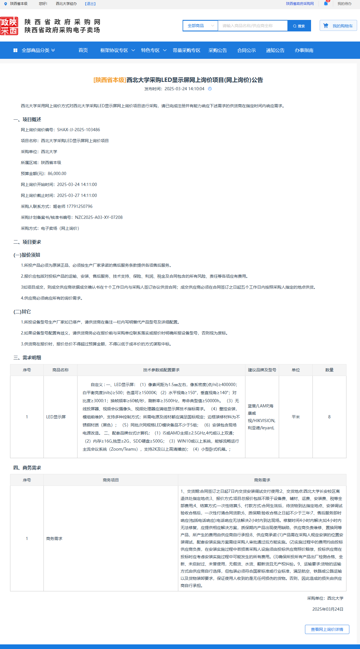 8868体育登录采购LED显示屏等网上询价项目(网上询价)公告 作者:采购与招标办公室 编辑: 时间:2025-03-24 原公告链接:https://www.ccgp-shaanxi.gov.cn/gpmall-main-web/basic/noticeDetail?noticeGuid=7303200839336919040