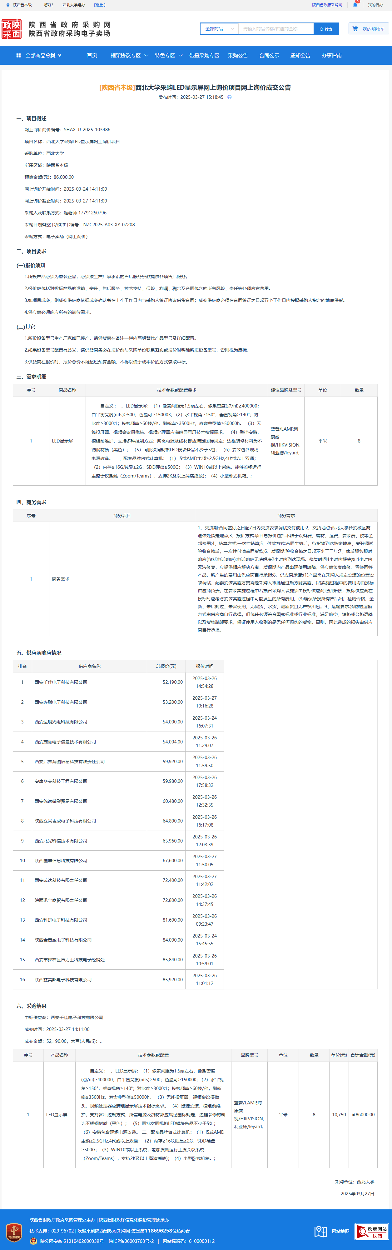 8868体育登录采购LED显示屏网上询价项目网上询价成交公告 作者:采购与招标办公室 编辑: 时间:2025-03-27 原公告链接:https://www.ccgp-shaanxi.gov.cn/gpmall-main-web/basic/noticeDetail?noticeGuid=7304305287710834688