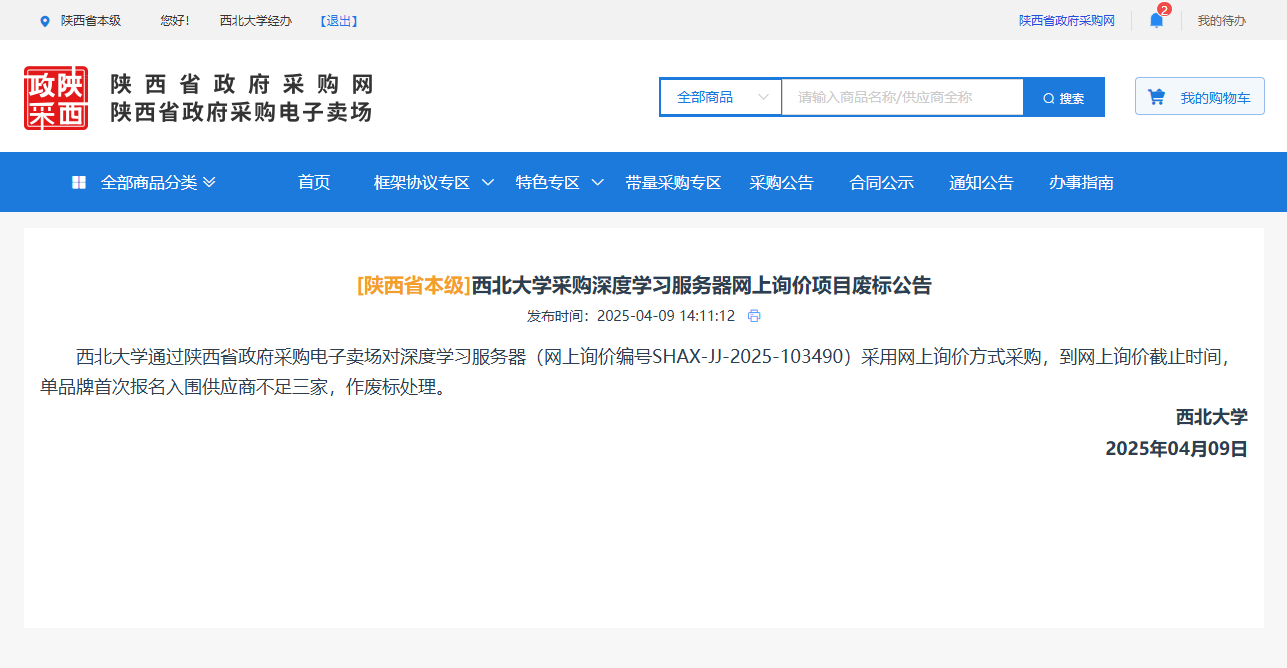 8868体育登录采购深度学习服务器网上询价项目废标公告 作者:采购与招标办公室 编辑: 时间:2025-04-09 原公告链接:https://www.ccgp-shaanxi.gov.cn/gpmall-main-web/basic/noticeDetail?noticeGuid=7308999329707130880