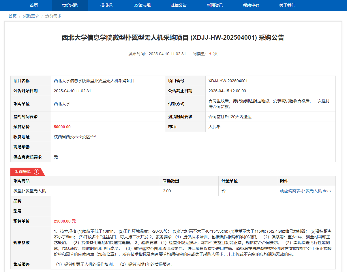 8868体育登录信息学院微型扑翼型无人机采购项目(XDJJ-HW-202504001)竞价采购公告 作者:采购与招标办公室 编辑: 时间:2025-04-10 原公告链接:https://www.ejingcai.com.cn/site/bidding/detail/17536