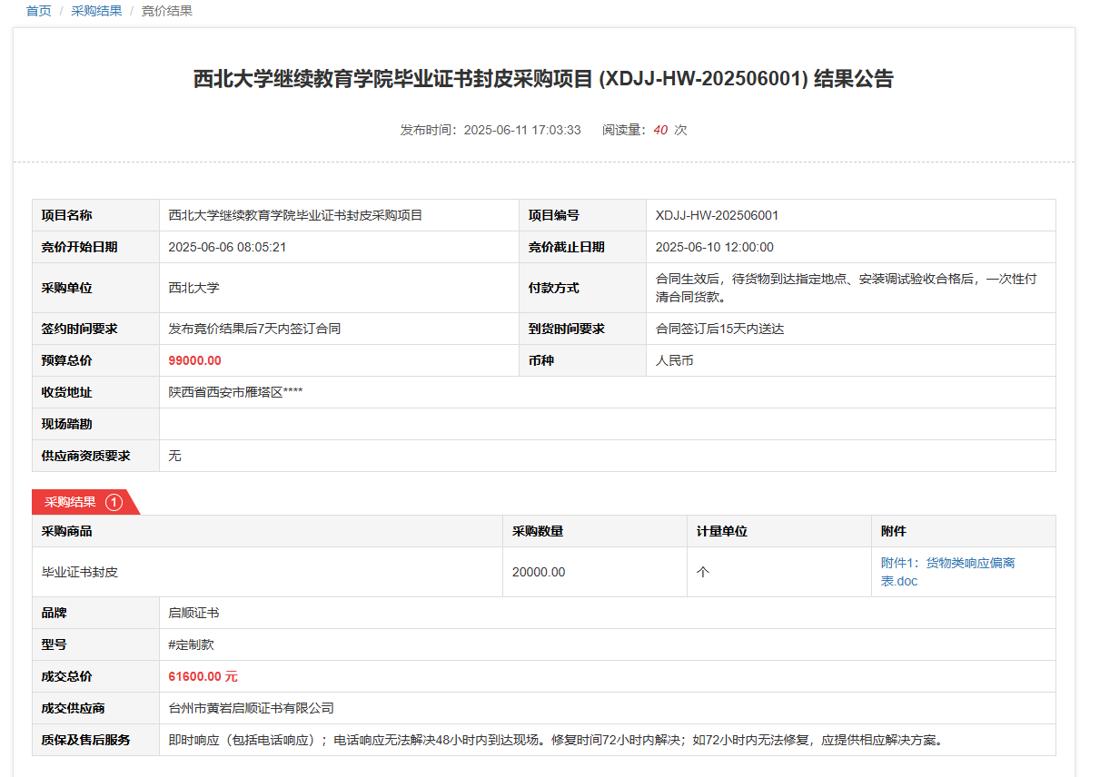 8868体育登录继续教育学院毕业证书封皮采购项目(XDJJ-HW-202506001)竞价结果公告 作者:采购与招标办公室 编辑: 时间:2025-06-12 原公告链接:https://www.ejingcai.com.cn/site/bidding/detail/18846