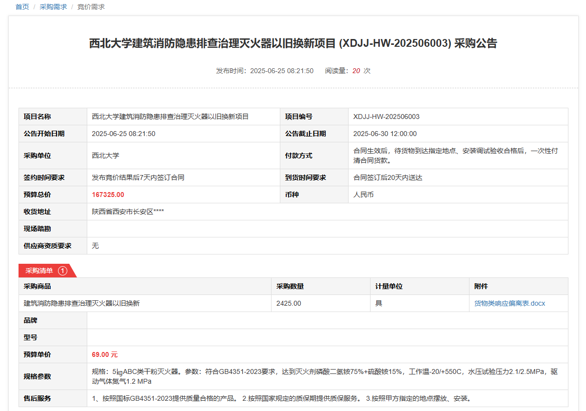 8868体育登录建筑消防隐患排查治理灭火器以旧换新项目(XDJJ-HW-202506003)竞价采购公告 作者:采购与招标办公室 编辑: 时间:2025-06-25 原公告链接:https://www.ejingcai.com.cn/site/bidding/detail/19167