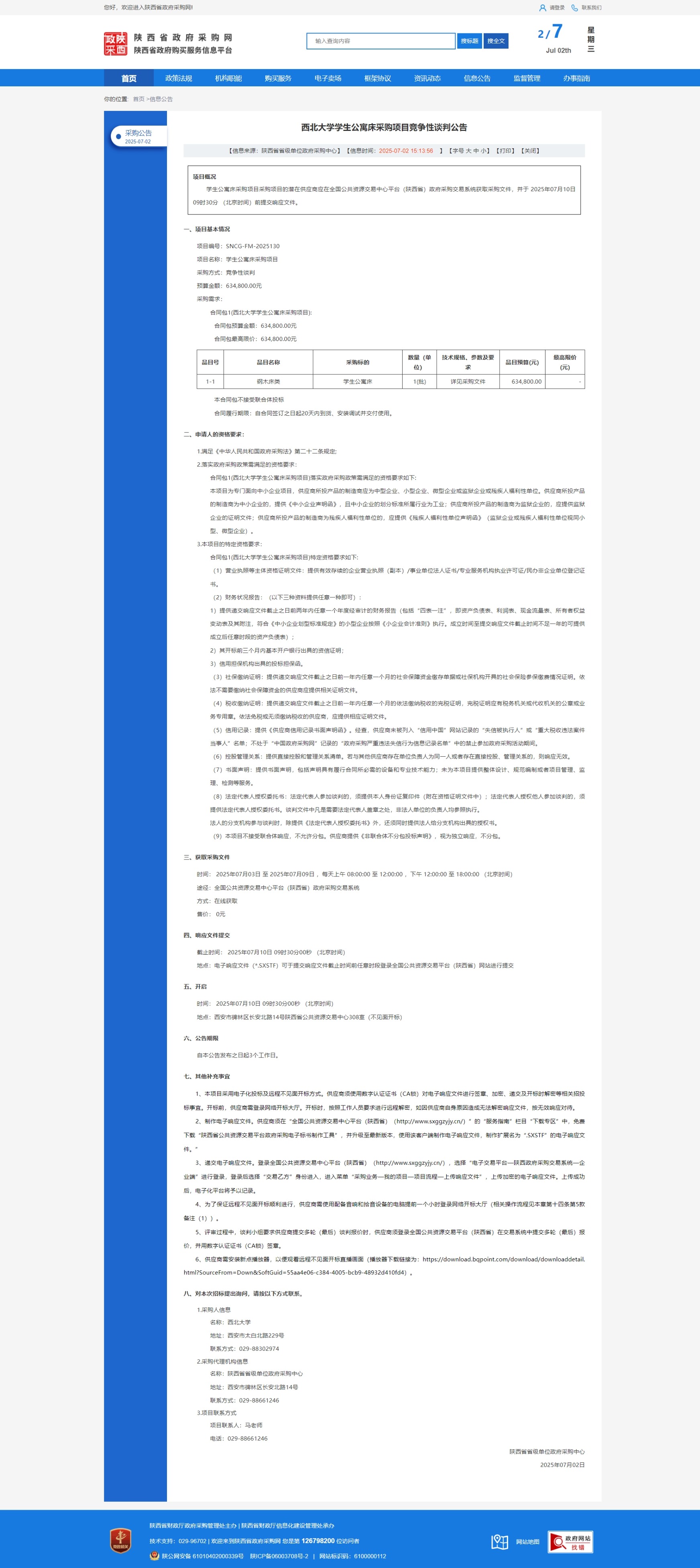 8868体育登录学生公寓床采购项目竞争性谈判公告 作者: 编辑:采购与招标办公室 时间:2025-07-02 原公告链接:https://www.ccgp-shaanxi.gov.cn/freecms/site/shaanxi/ggxx/info/2025/8a69c67497a9ff030197c8e900a9510c.html?noticeType=001013¬iceId=1bd2af55-5716-11f0-8063-08c0eb20c666
