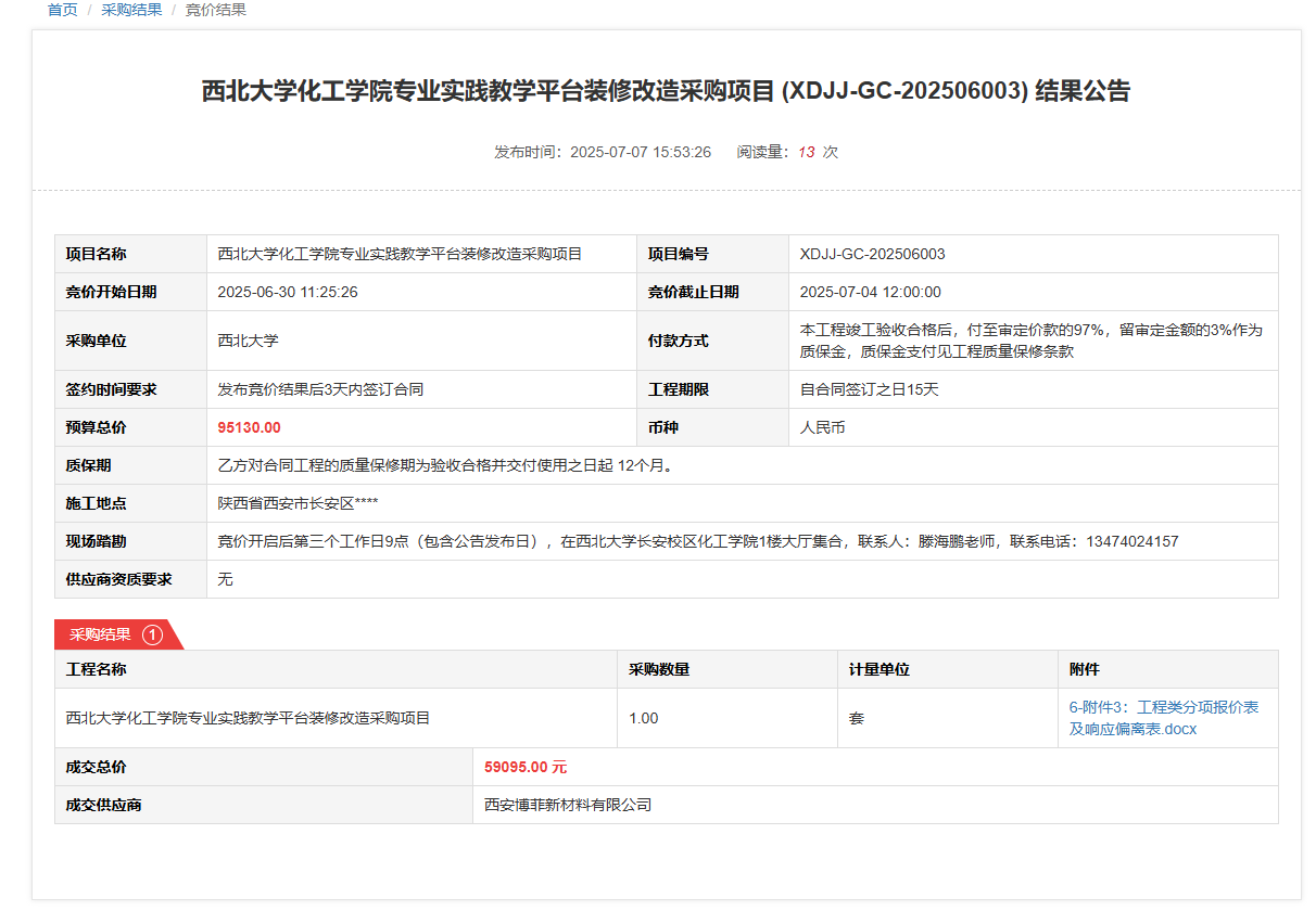 8868体育登录化工学院专业实践教学平台装修改造采购项目(XDJJ-GC-202506003)竞价结果公告