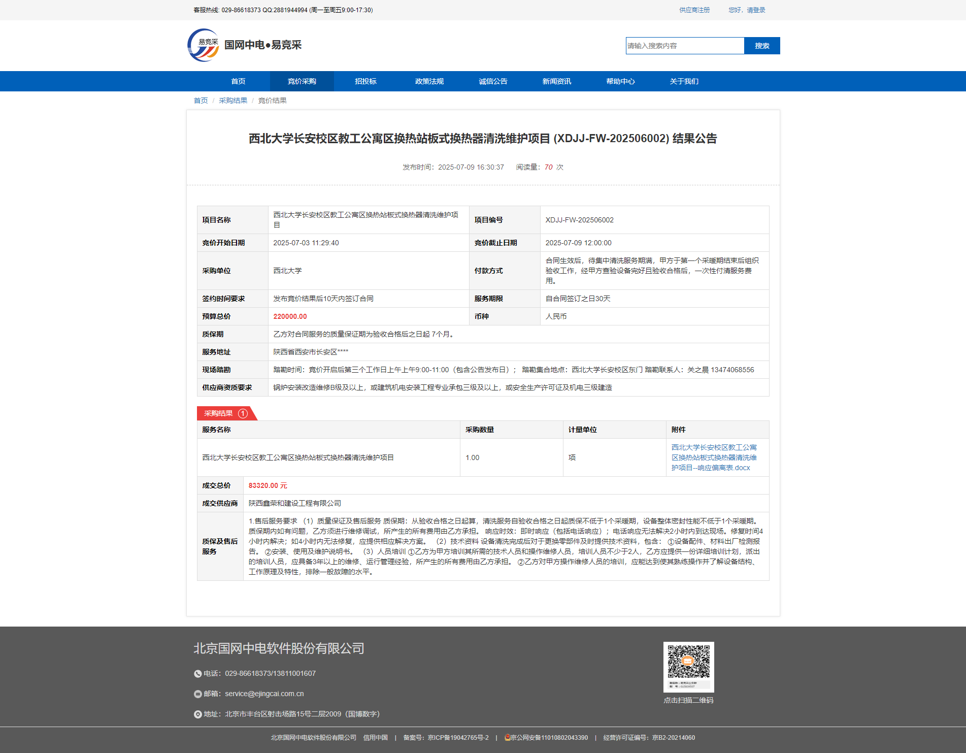 8868体育登录长安校区教工公寓区换热站板式换热器清洗维护项目 (XDJJ-FW-202506002) 结果公告