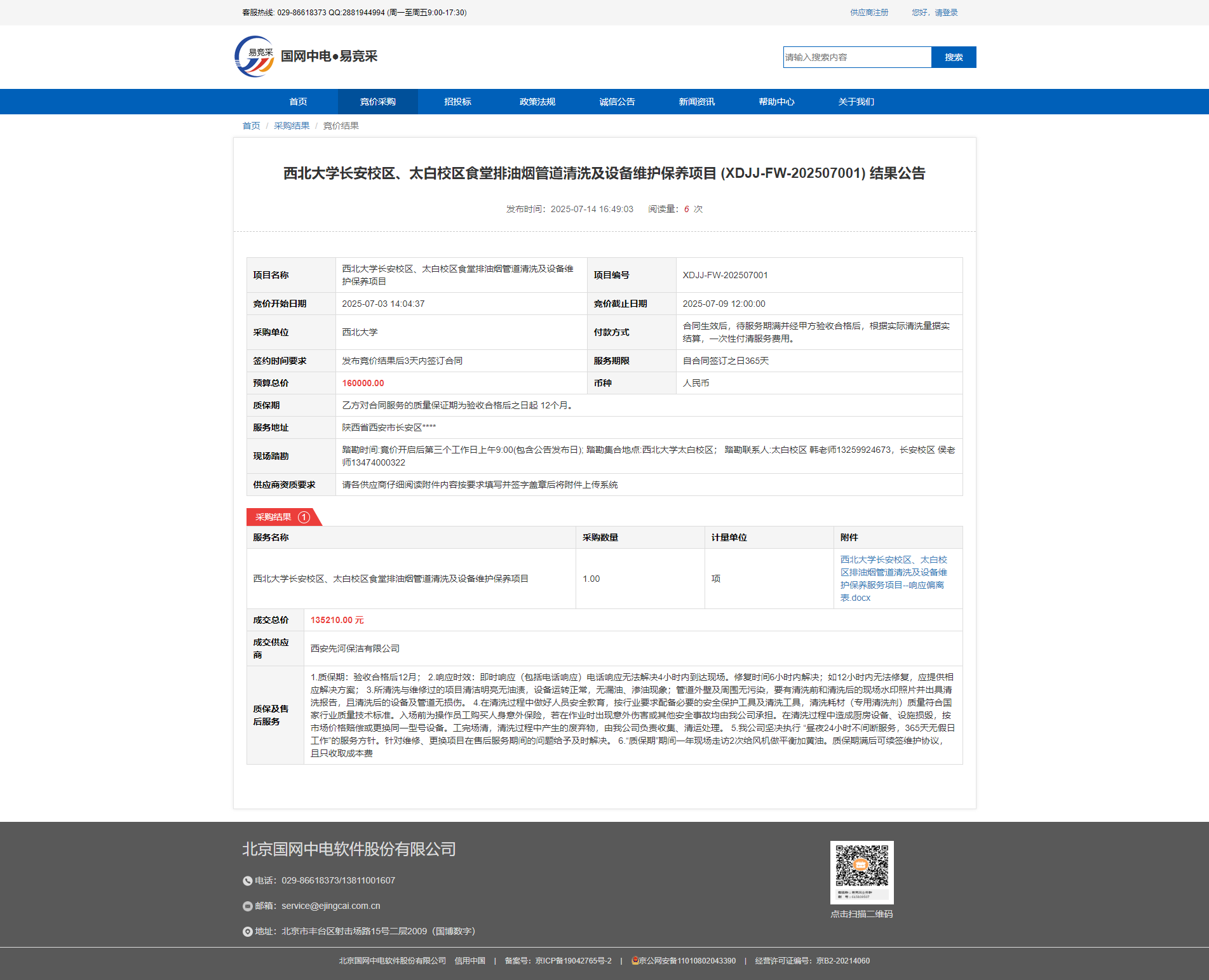 8868体育登录长安校区、太白校区食堂排油烟管道清洗及设备维护保养项目 (XDJJ-FW-202507001) 结果公告