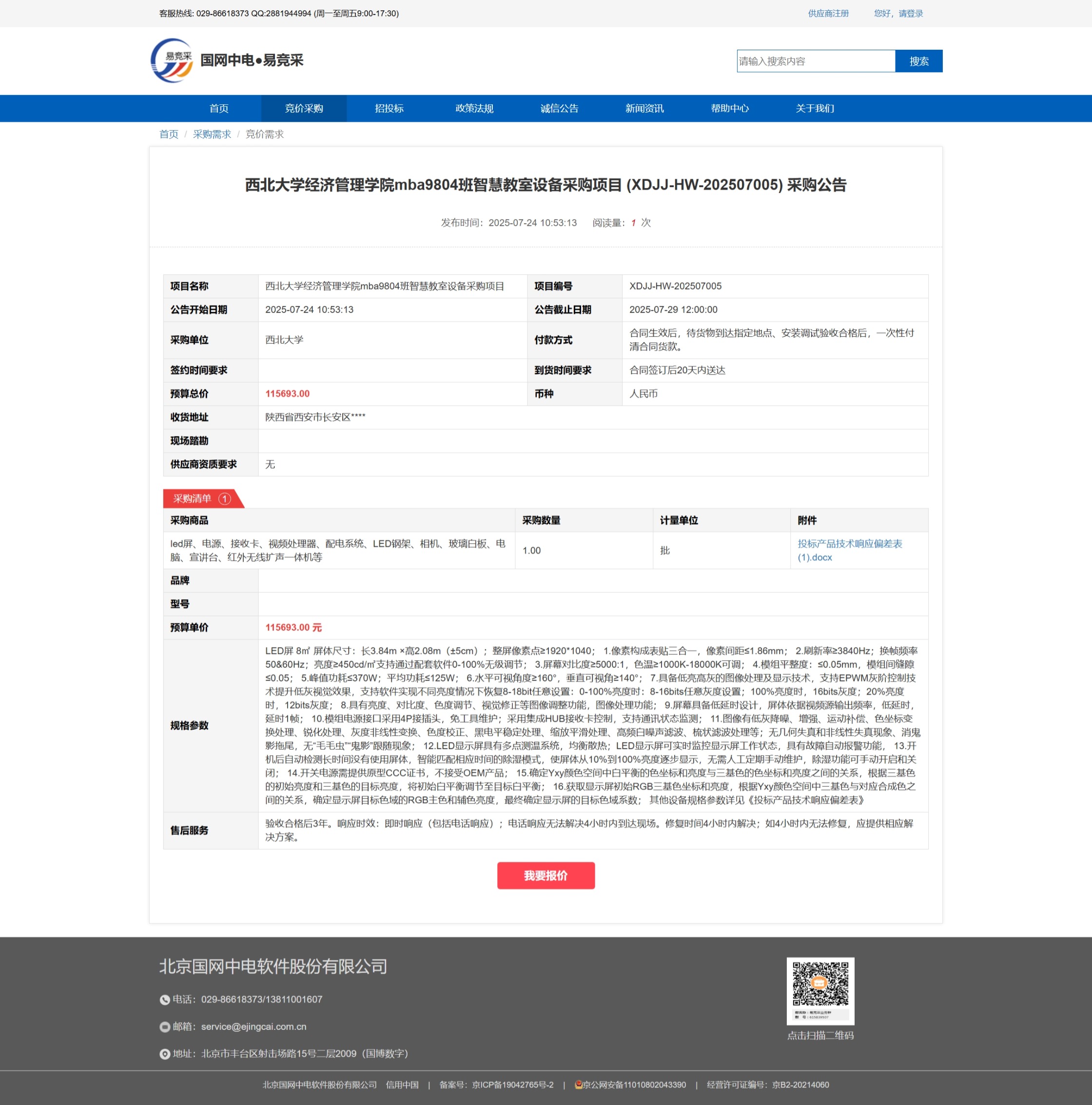 8868体育登录经济管理学院mba9804班智慧教室设备采购项目 (XDJJ-HW-202507005)竞价采购公告 作者: 编辑:薛利娟 时间:2025-07-24 原公告链接:https://www.ejingcai.com.cn/site/bidding/detail/19708