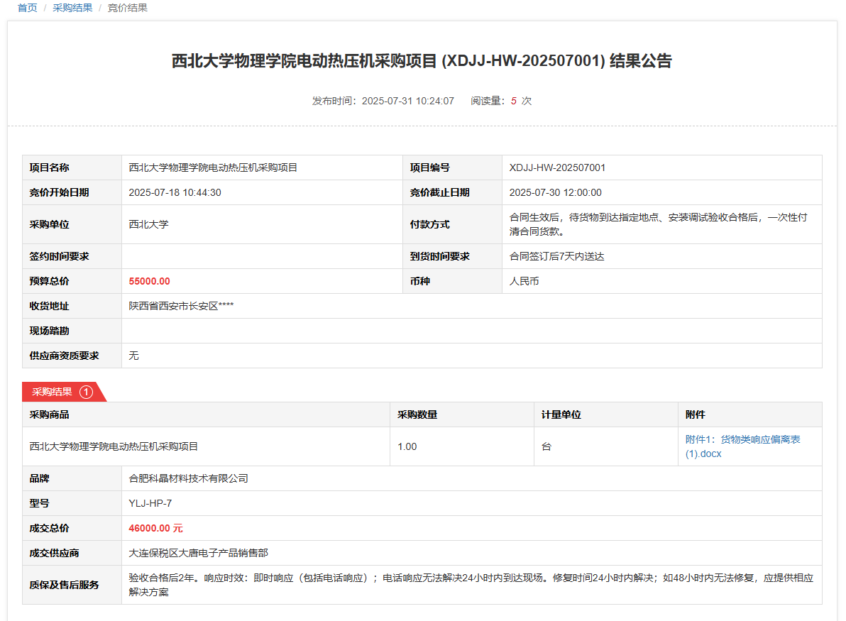 8868体育登录物理学院液相色谱仪采购项目(XDJJ-HW-202507002)竞价结果公告
