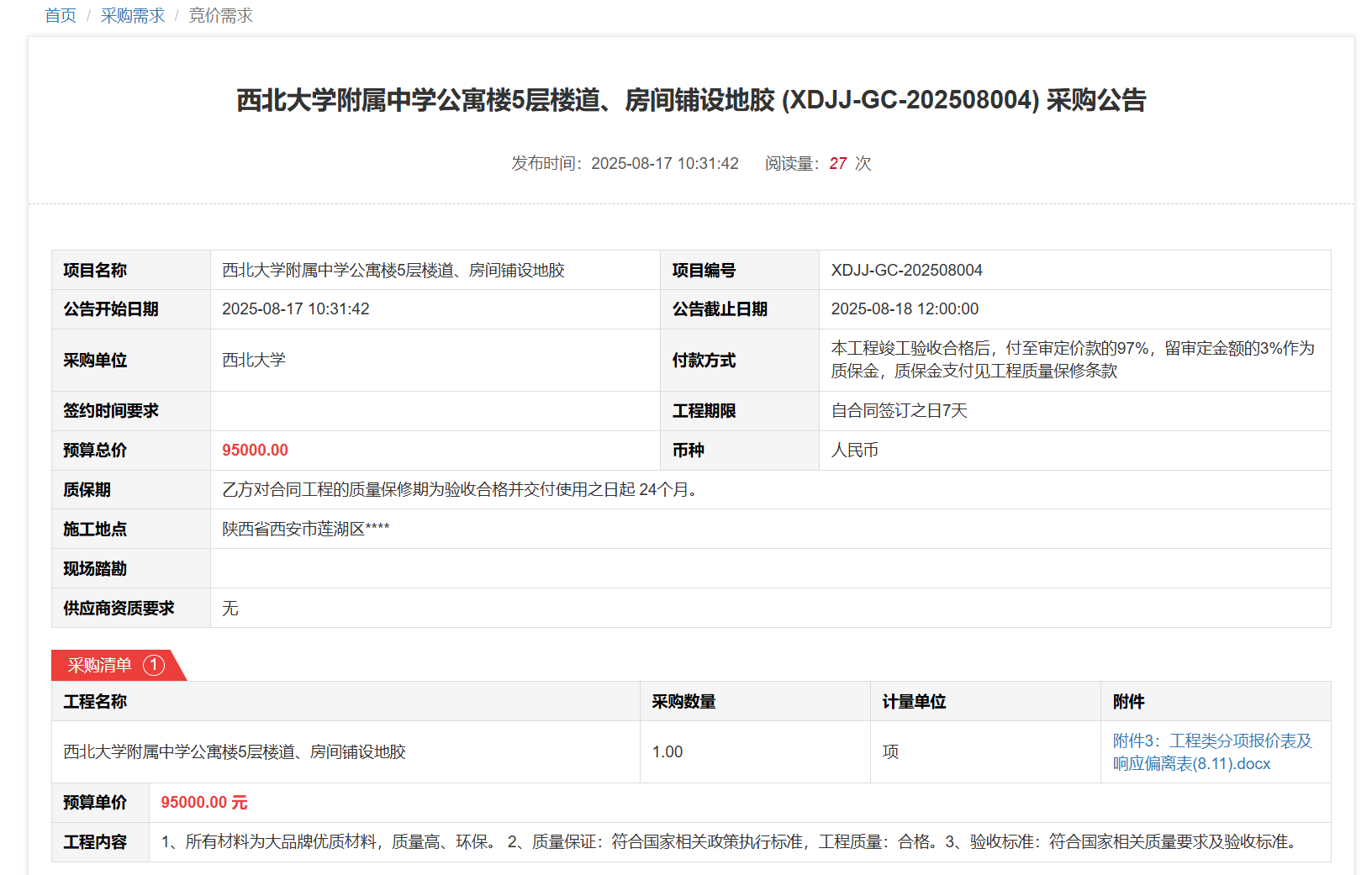 8868体育登录附属中学公寓楼5层楼道、房间铺设地胶(XDJJ-GC-202508004)竞价采购公告