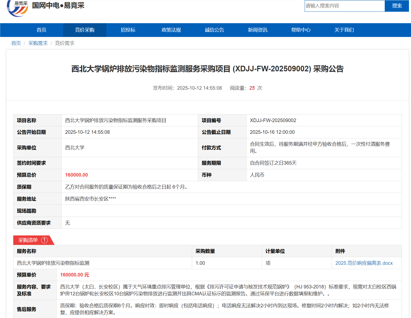 8868体育登录锅炉排放污染物指标监测服务采购项目(XDJJ-FW-202509002)竞价采购公告