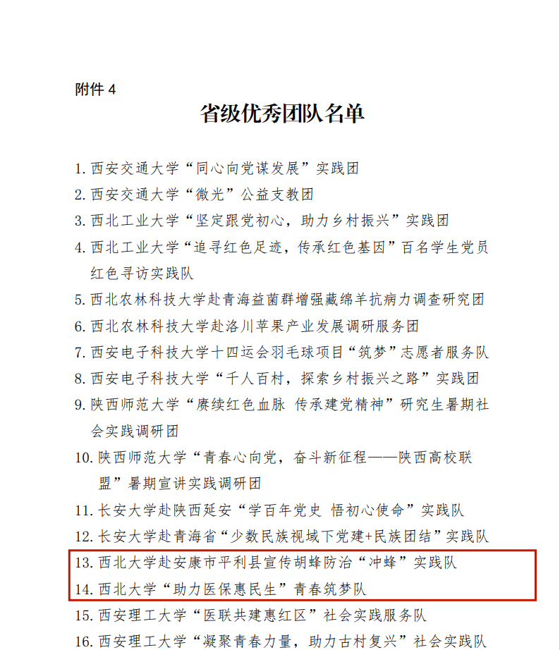 近日,中共陕西省委宣传部、中共陕西省委文明办、中共陕西省委教育工委、共青团陕西省委、陕西省学生联合会印发《关于2021年陕西省大中专学生志愿者暑期文化科技卫生“三下乡”社会实践活动先进集体、先进个人的通报》,8868体育登录荣获2021年“三下乡”省级示范学校荣誉称号。经济管理学院“奋斗百年路启航新征程百村千户行”社会实践团荣获“省级标兵团队”荣誉称号。生命科学学院赴安康市平利县宣传胡蜂防治“冲蜂”实践队、公共管理学院“助力医保惠民生”青春筑梦队荣获“省级优秀团队”荣誉称号。8868体育登录翟绍果、范铭沁、张桥三位老师荣获“省级先进个人”荣誉称号。