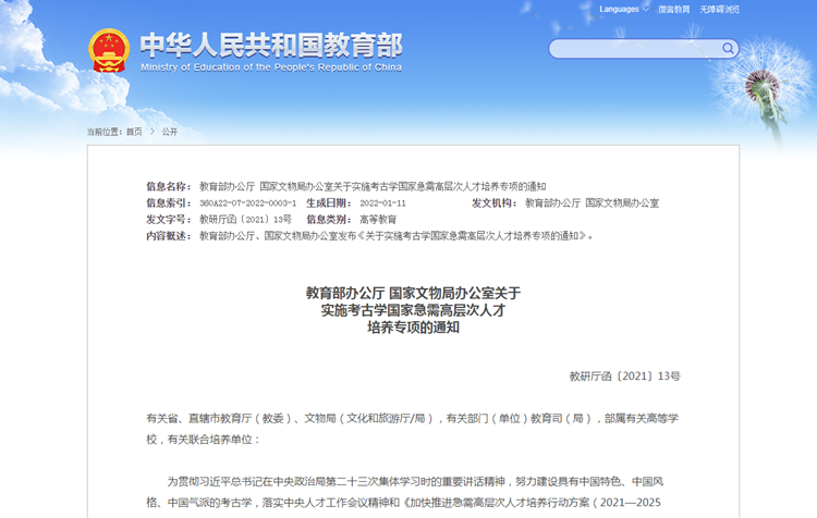 教育部发布《教育部办公厅国家文物局办公室关于实施考古学国家急需高层次人才培养专项的通知》。
