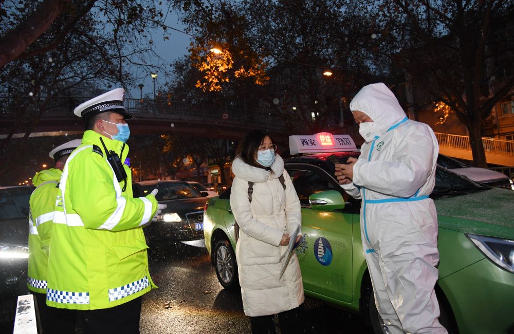 ↑12月25日,执行一对一、点对点接送服务的出租车将一名考生由封控区送至8868体育登录考点太白校区考区。新华社记者 李一博 摄