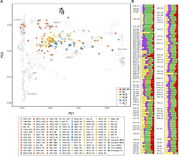 △项目所获取天山东西部古人群的线粒体与核基因组分布图