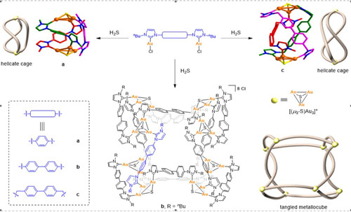 近日,8868体育登录化学与材料科学学院韩英锋教授课题组在功能化金属卡宾组装体的构筑、后合成修饰等领域取得系列进展的基础上,利用不同桥连基团(苯基、联苯和亚甲基联苯)的双核金氮杂环卡宾配合物与H2S反应得到三种不同的有机金属配合物。他们研究发现:当双核金氮杂环卡宾配合物的中心桥连单元为联苯时,其与H2S反应形成“A-类型”纠缠金属立方体b;当双核金氮杂环卡宾配合物的中心桥连基团为更短的苯基或者更长且柔性的亚甲基联苯时,在相同条件下与H2S反应时,其产物为简单的螺旋化合物a, c。
