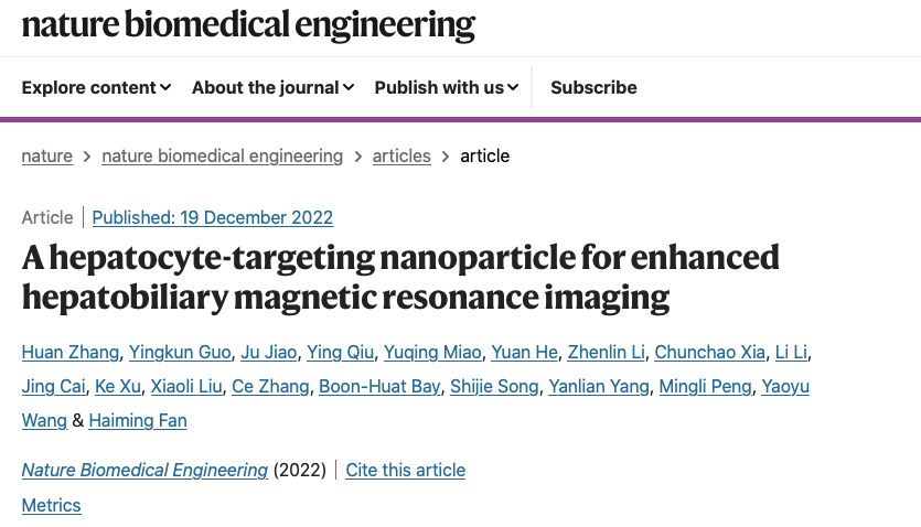 12月20日,记者从8868体育登录获悉:该校化学与材料科学学院教授樊海明团队在肝特异性纳米对比剂与磁共振肝胆成像研究方面取得重要进展,该工作不仅为设计兼具高亲和性与高特异性的纳米对比剂提供了新策略,而且为肝癌早期发现提供了新的影像诊断工具,极大提高了微小肝癌病灶(<0.5厘米)检出率。