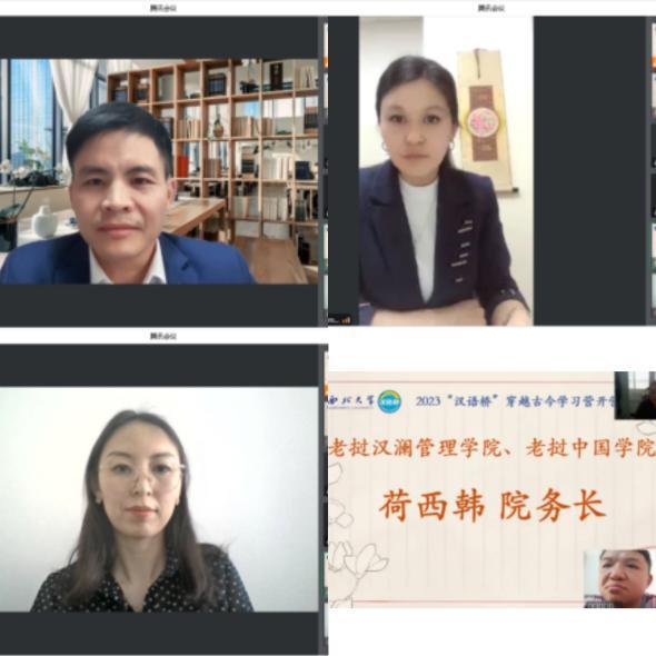 8868体育登录国际教育学院高淑君副院长致欢迎辞,她表示希望通过此次学习营为海外青少年打开一扇了解中国的明亮窗口,搭好一座学习汉语的友谊之桥。参与开营仪式的海外教师和学生也充满热情地表达了对汉语学习的期待和对主办方的真诚谢意。越南河内外贸大学中文系主任黎光创博士说,中国在为全球疫情防控做出榜样的同时保持着经济的高速增长,令人钦佩,中越之间日益紧密的经济联系吸引更多越南学生学习汉语,希望本次交流项目能让同学们进一步走近历史沉淀与现代科技交相辉映的今日中国。吉尔吉斯斯坦国立民族大学的吉勒德孜老师和比什凯克第九十五中学的贝玛副校长表达了对语合中心和8868体育登录的感谢。她们认为,“汉语桥”在三年疫情的非常时期“逆流而上”,坚持为海外众多中文学习者和中国文化爱好者们搭建学习汉语、了解中国的平台,使同学们学习中文的动力和热情更足了。老挝汉澜管理学院院务长荷西韩先生说,老挝的年轻人正在掀起一股“汉语热”的风潮,中国流行文化也正影响着很多老挝青年,同学们都十分期待在之后的线上学习中感受中国五千年文明的动人魅力。