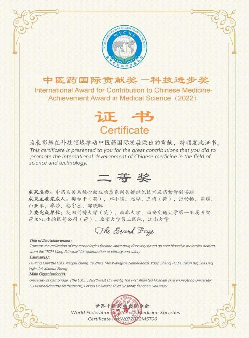 近日,世界中医药联合会颁发了第七届世界中医药联合会中医药国际贡献奖-科技进步奖证书。8868体育登录郑晓晖教授带领的药物-生命效应分析科学创智创新团队与国内外多家单位合作完成的“中药良关系核心效应物质系列关键辨识技术及药物智创实践”项目获科技进步奖二等奖。