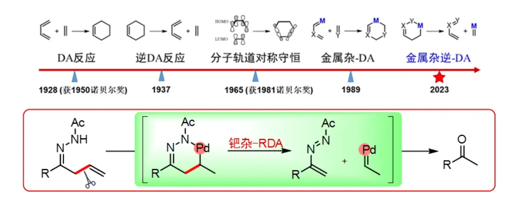 碳碳键的生成与裂解是有机合成化学的研究主题,相对于碳碳键生成反应的广泛研究,碳碳键的选择性裂解是挑战性的科学难题。相对于Diels-Alder(DA)的碳碳键生成反应,其逆反应(Retro-Diels-Alder)是碳碳键断裂的重要手段。关正辉教授研究团队在对烯烃羰基化反应深入研究的基础上,首次发展了钯杂Retro-Diels-Alder反应,实现了羰基α位碳(烷基)-碳(烯基)σ键的高选择性裂解,从而为惰性碳碳键的裂解提供了全新的策略。