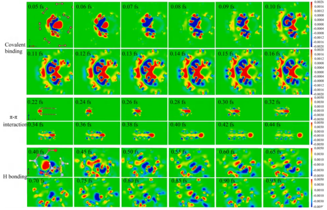 离子束辐照下靶材的电离机制是扩展离子束技术应用的关键科学问题。研究团队建立了包含共价键、π-π相互作用和H键的双壁碳纳米管、自组装双层石墨烯纳米片和DNA双螺旋三种材料模型,并在TDDFT框架下跟踪了阿秒尺度下非绝热能量转移、电子阻止本领、原子受力和电荷布局数的演化。已占据的共价键可以迅速传导被激发电子,分子层之间的π-π相互作用有效地阻断了被激发电子的回流,从而导致材料的局部电离。氢键通过质子跃迁来引导少量的激发电子,最终使得DNA分子中由激发电子涨落机制引起的碱基对电离。