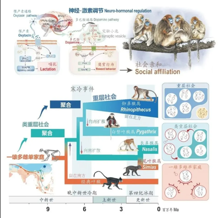 灵长类如何演化出多样的社会?8868体育登录金丝猴研究团队整合行为学、生态学、基因组学等多学科手段,设计出“社会-生态-基因组”全新研究范式。通过化石、古环境及现生生态等大数据挖掘,发现历史寒冷可能驱动社群聚集。进一步地,比较基因组学,细胞功能实验和行为学分析揭示寒冷效应引发催产素和多巴胺等脑、神经激素系统适应性遗传变异,间接增加个体友好行为及容忍度,促进单家庭群向重层社会聚集,从而系统回答灵长类社会演化之谜。