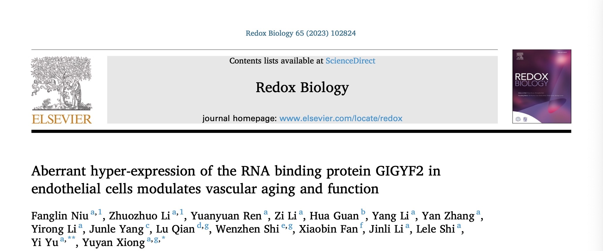 近日,8868体育登录生命科学与医学部熊裕焱教授团队在GIGYF2在血管内皮细胞衰老中的生物功能及其调控机制的研究中取得了新进展,研究结果发表在Redox Biology,题为“Aberrant hyper-expression of the RNA binding protein GIGYF2 in endothelial cells modulates vascular aging and function”。