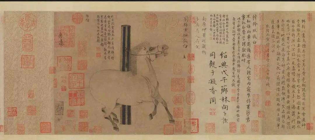 这幅作品写实、写意兼具,画家尽管不着一色,仅用淡墨勾勒渲染,今人仍然能隔着千年,从中国笔墨的神韵中观赏到“照夜白”昔日鬃毛飞扬、昂首嘶鸣、桀骜不驯的风姿,和属于汗血宝马独有的雄浑健硕的生命张力以及欲腾翔千里的志趣。画中马几经流转,历经李煜、乾隆之手流失海外,现藏于美国大都会博物馆。
