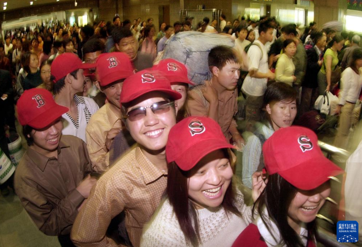 2004年5月1日,在杭州火车站出口处,大批旅行团游客准备出站。“五一”期间,来自全国各地的大批游人通过铁路和公路涌入杭州,形成旅游高峰。新华社发(李震宇 摄)