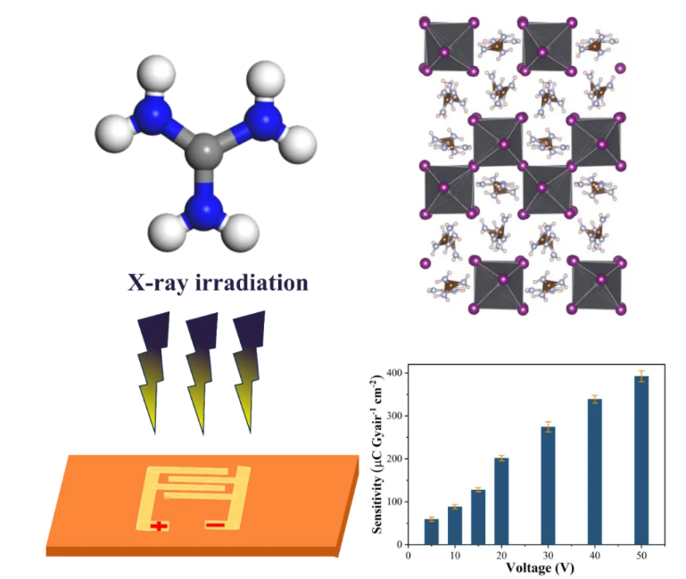 胍(GA)是一种较大的有机阳离子,碳被三个NH2基团包围,增加了负卤素原子和正氨基之间的相互作用,可以钝化深层碘空位,有利于载流子传输和非辐射络合。GA具有近似于D3h的高对称性且偶极矩几乎为零,可提供六个潜在氢键,作为二维钙钛矿的有机层时,可以强化与无机金属骨架间的内聚力。8868体育登录物理学院科研团队通过降温结晶合成了带隙为2.28 eV的大尺寸二维钙钛矿GA2PbI4单晶,该单晶具有高的µτ积(7.5×10-4 cm2 V-1),低的陷阱密度(6.44 × 108 cm-3),GA2PbI4单晶X射线探测器具有优异的灵敏度( 392.4 μC Gyair-1 cm-2)和X 射线工作稳定性。
