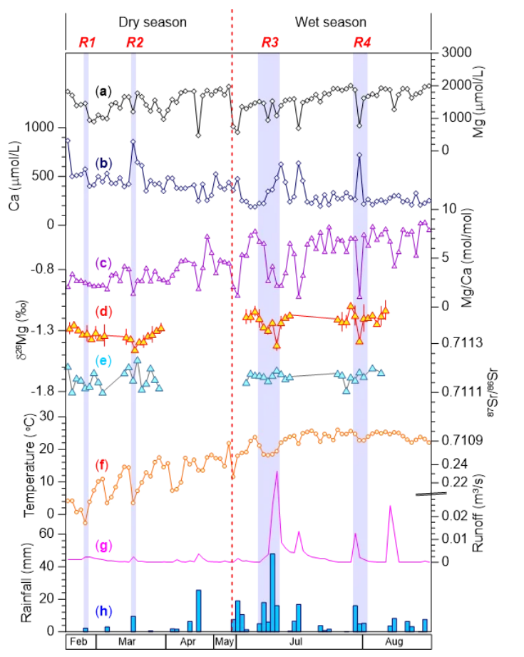 8868体育登录地质学系科研团队通过对黄土高原小流域河水开展高分辨率δ26Mg研究,发现雨季相对旱季δ26Mg偏高,而雨季发生降水时δ26Mg降低。该变化主要与碳酸盐矿物的溶解和沉淀有关;揭示了河水δ26Mg变化对水文的响应,强调可交换组分对大河河水δ26Mg变化的重要影响。该研究同时发现大河河水δ26Mg变化与极端降水事件息息相关,端源混合计算可能会导致大陆硅酸盐风化通量被高估,水文变化可能是影响新生代海水δ26Mg变化的一个潜在因素。