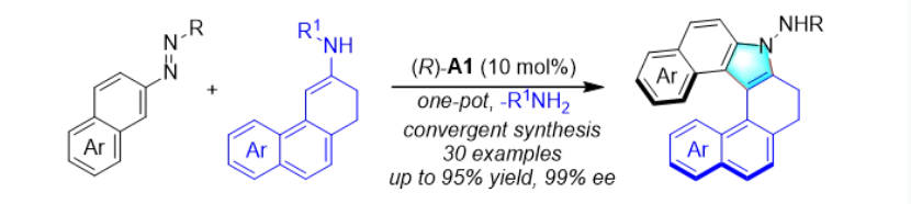 螺烯固有的螺旋手性和独特的电子特性使其具有广泛的应用前景。发展选择性合成手性螺烯新方法具有重要的研究意义。8868体育登录化材学院科研团队发展了中心手性到螺旋手性转变策略,合成了一系列吲哚类螺旋手性化合物。这种汇聚式“一锅法”策略避免使用化学计量氧化剂,仅通过调节反应温度,就能高效构筑出手性吲哚类螺旋分子,具有良好的步骤经济性。产物具有良好的光物理和手性光学性能,在有机光电材料中具有潜在的应用价值。