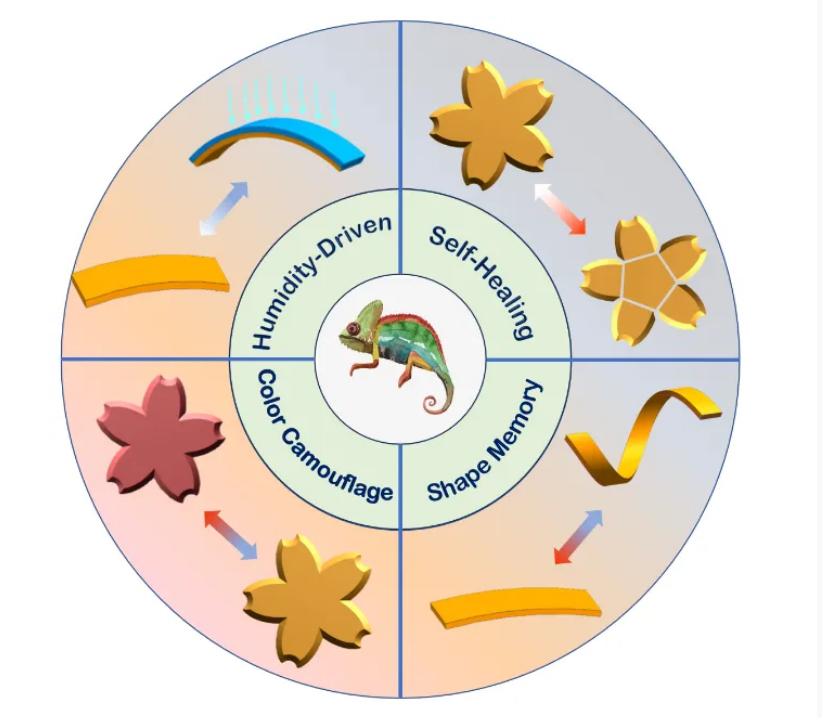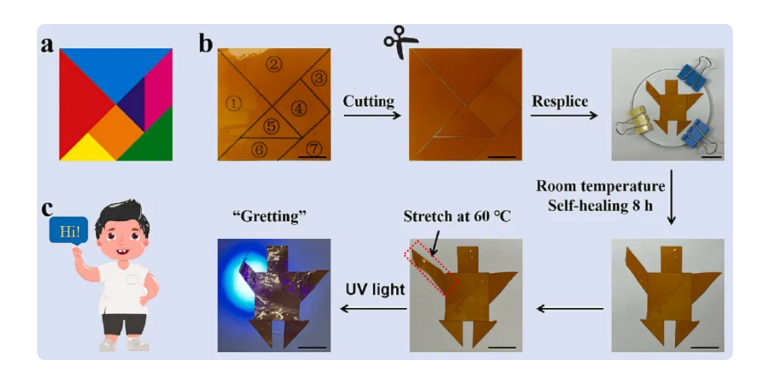 8868体育登录化材学院科研团队在烯烃羰基化反应研究基础上,成功合成了一种集多功能为一体的高分子智能材料TASNP30。该材料不仅表现出优异的热致变色(黄→红)和湿度驱动(△RH低至30%,可对人体手掌湿度做出响应)功能,而且具有优秀的形状记忆和自愈合性能(60oC修复率>95%)。该材料可用于仿生伪装、湿度传感、信息加密等领域。