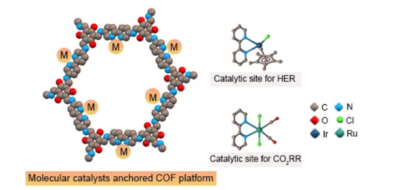 在COFs结构中构建分子催化单元,不仅能赋予COFs特定的催化活性,也能提高分子催化剂的稳定性与可循环利用性。8868体育登录化材学院科研团队以包含丰富的联吡啶单元的COF材料TpBpy为载体,通过后修饰的方法,分别将具有催化质子还原产氢功能的[Cp*Ir(Bpy)Cl]和催化CO2还原功能的[Ru(Bpy)(CO)2Cl2]锚定到TpBpy的结构中。以[Ru(Bpy)3]Cl2作为光敏剂,以所制备的TpBpy-Ir和TpBpy-Ru为催化剂,分别实现了光催化产氢与CO2还原。