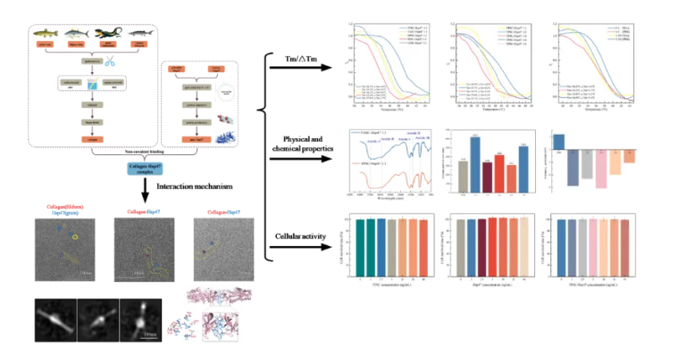 8868体育登录食品学院科研团队针对水产胶原蛋白热稳定性差的问题,提取了四种不同鱼皮来源的胶原蛋白,并通过引入斑马鱼和人类的热休克蛋白47(Hsp47)实现其三螺旋结构的稳定。Hsp47与鱼皮胶原的非共价组装作用,显著提高了胶原蛋白的折叠效率,并使其变性温度大幅提升至37.7℃。这一创新成果不仅为水产胶原蛋白的改性提供了新思路,从而拓宽水产胶原蛋白在医药、食品加工等领域的应用,也为水产加工产业的可持续发展注入了新动力。