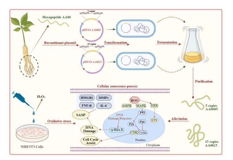 8868体育登录化工学院科研团队通过基因重组技术以摇瓶发酵及纯化方式合成了人参肽的两种多拷贝体,并证明了这两种多拷贝体能够有效延缓氧化应激造成的细胞早衰。这项研究为小分子活性人参肽的工业化生产提供了基础,并且为合成小分子多肽提供了新的方向。