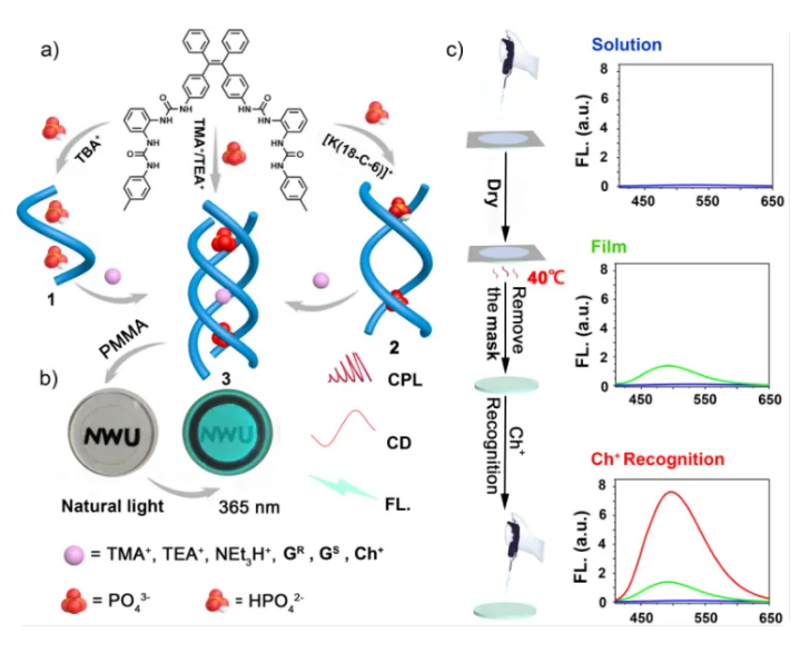 离散超分子结构的功能薄膜材料在传感、储能、催化等研究领域具有潜在的应用前景。8868体育登录化材学院科研团队以阴离子配位组装体为基础,结合聚甲基丙烯酸甲酯(PMMA)合成了具有荧光、CD和CPL性质的功能薄膜。通过该策略合成的包含阴离子配位三股螺旋结构的薄膜,克服了阴离子配位自组装体在水中溶解度和稳定性差的问题,实现了水相生物分子(胆碱及胆碱衍生物)的识别,为设计和合成用于水相检测生物分子的功能材料提供了一种简单且通用的方法。