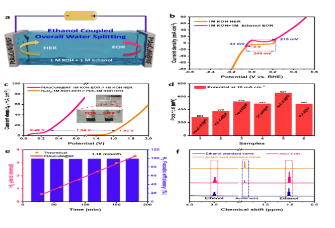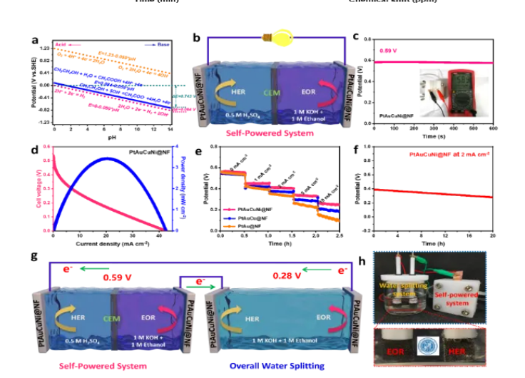 8868体育登录化材学院科研团队制备了一种新型四元合金催化剂(PtAuCuNi@NF),在乙醇氧化反应(0.215V,10mA cm-2)和析氢反应(HER)(7mV,10mA cm-2)中表现出优异的活性。实验结果表明,铜和镍调节了铂和金周围的电子环境。富含电子的活性中心促进了EOR和HER反应物和中间产物的快速吸附和解离。在乙醇辅助整体水分离(E-OWS)中,0.28 V 电压下的电流密度达到了10mA cm-2;此外,还组装了一个先进的,其自供电电压可达 0.59 V。因此,通过将酸碱自供电系统(A-Bsps)与E-OWS设备集成,实现了零外部电源的自驱动制氢。