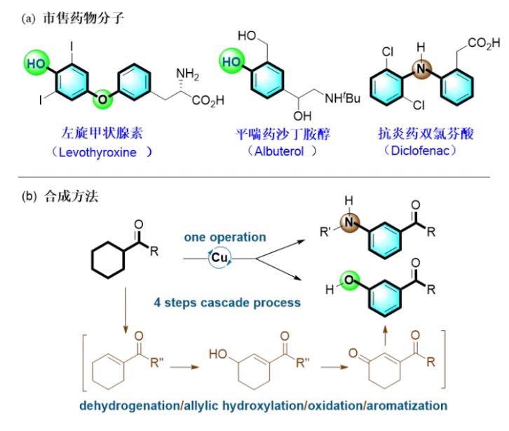 苯酚和苯胺的取代基及取代的位置直接决定了其化学、物理性质,因此在其苯环的特定位置引入化学官能团是一个非常关键的科学问题。由于羟基和氨基强的给电子能力及对应的邻、对位定位效应,通过芳香亲电取代反应原则上主要得到邻位和对位取代的产物,而间位取代的产物很难得到。8868体育登录化材学院科研团队利用铜催化的脱氢氧化串联策略,实现了间位羰基的苯酚和苯胺选择性合成。由于羰基处于有机合成的枢纽,通过其进一步转化,可以合成各种分子单元。本方法为间位取代酚类和苯胺提供了一种通用的合成路径。