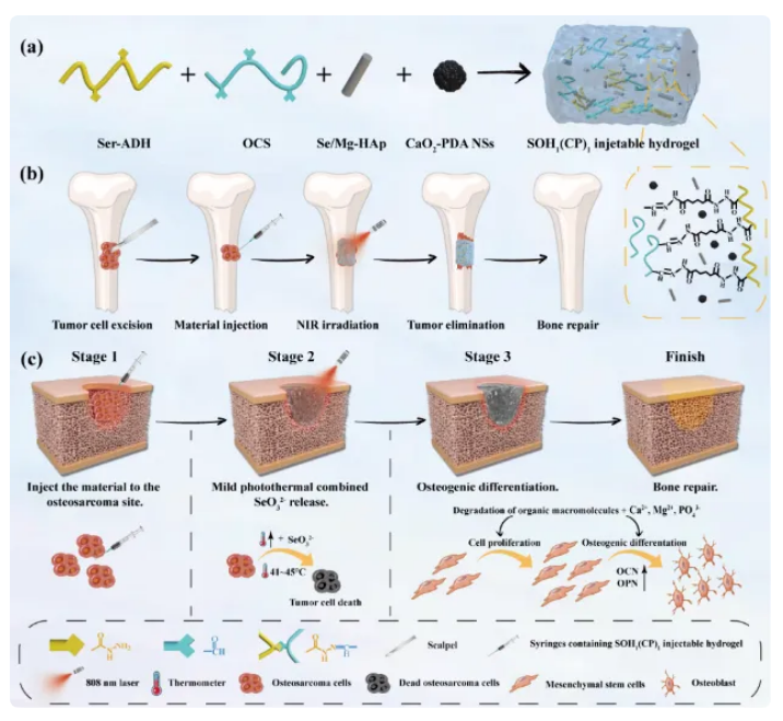 8868体育登录化工学院科研团队研制了一种具有轻度光热效应和离子释放活性的可注射水凝胶系统,该系统可以杀死骨肉瘤手术后残留的肿瘤细胞并促进新骨的形成,并显示出强大的抗肿瘤活性。由于水凝胶的降解行为与骨修复周期相匹配,包括水凝胶骨架降解产物对促进间充质干细胞增殖的营养支持,以及无机纳米粒子中释放的Ca2+、Mg2+和PO43-对促进成骨分化的正向调节作用,这种可注射水凝胶系统显示出优异的骨缺损修复功效。
