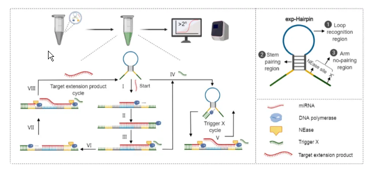 指数扩增反应(EXPAR)是一类利用扩增产物创造新的引物模板复合物,从而在短时间内指数级扩增出大量核苷酸产物的等温扩增技术。EXPAR技术走向实际应用存在着扩增效率的大量损失、难以区分同源序列以及模板的通用性不高等问题。8868体育登录化材学院科研团队开发了一种新的发夹模板(exp-Hairpin)用于提高EXPAR检测microRNA的性能,该exp-Hairpin模板的理论扩增效率超过2n且背景扩增极低。该研究成果有望推动EXPAR技术走向应用,加速短序列核酸的简单和快速分子诊断。