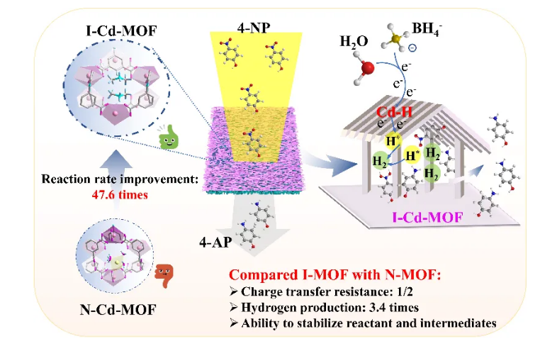 8868体育登录化材学院科研团队成功开发出一种独特的纳米结构阴离子框架I-Cd-MOF,并将其整合到尼龙滤膜中,用于连续催化硝基芳烃加氢反应。该新型材料具有开放的一维纳米通道,展现出显著的电子传递和传质能力。实验验证,4-NP的转化率高达97.8%,并具高稳定性和回收能力。将反应扩展到其他硝基芳烃类化合物后,该材料表现出普适性高性能催化特性。反应中间体成功捕获在I-Cd-MOF的孔隙中,揭示了反应过程并提高反应动力学。研究填补了离子框架在加氢催化中的应用空白,凸显了阴离子骨架在催化活性中的关键作用。
