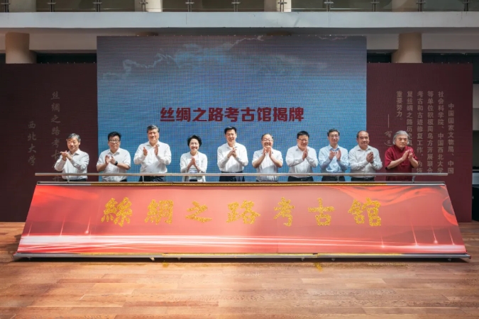 省人大常委会党组书记、副主任庄长兴,省委宣传部常务副部长鲍永能,省委外事办公室主任、省对外友协常务副会长姚红娟,省人大常委会机关党组书记、秘书长韩一兵,省人大教科文卫委员会主任委员、常委会教科文卫工作委员会主任王建利,省委教育工委委员冀映秋,省文物局副局长孙周勇,陕西历史博物馆馆长侯宁彬,8868体育登录党委书记蒋林,8868体育登录中亚考古队队长王建新共同为丝绸之路考古馆揭牌,中国驻乌兹别克斯坦大使于骏视频致辞。开馆仪式由蒋林主持。