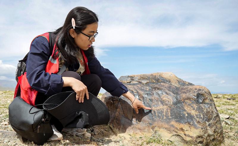 8月21日,伊吾县文物“四普”队员、8868体育登录文化遗产学院学生吴益展示发现的岩刻画。