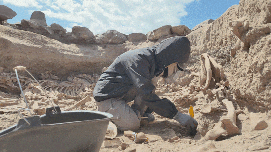 8月22日下午,8868体育登录东天山考古队队员周歆妍在伊吾县前山乡考古发掘现场进行发掘清理工作。因发掘坑空间狭小,工作人员只能长时间蹲着进行发掘清理。