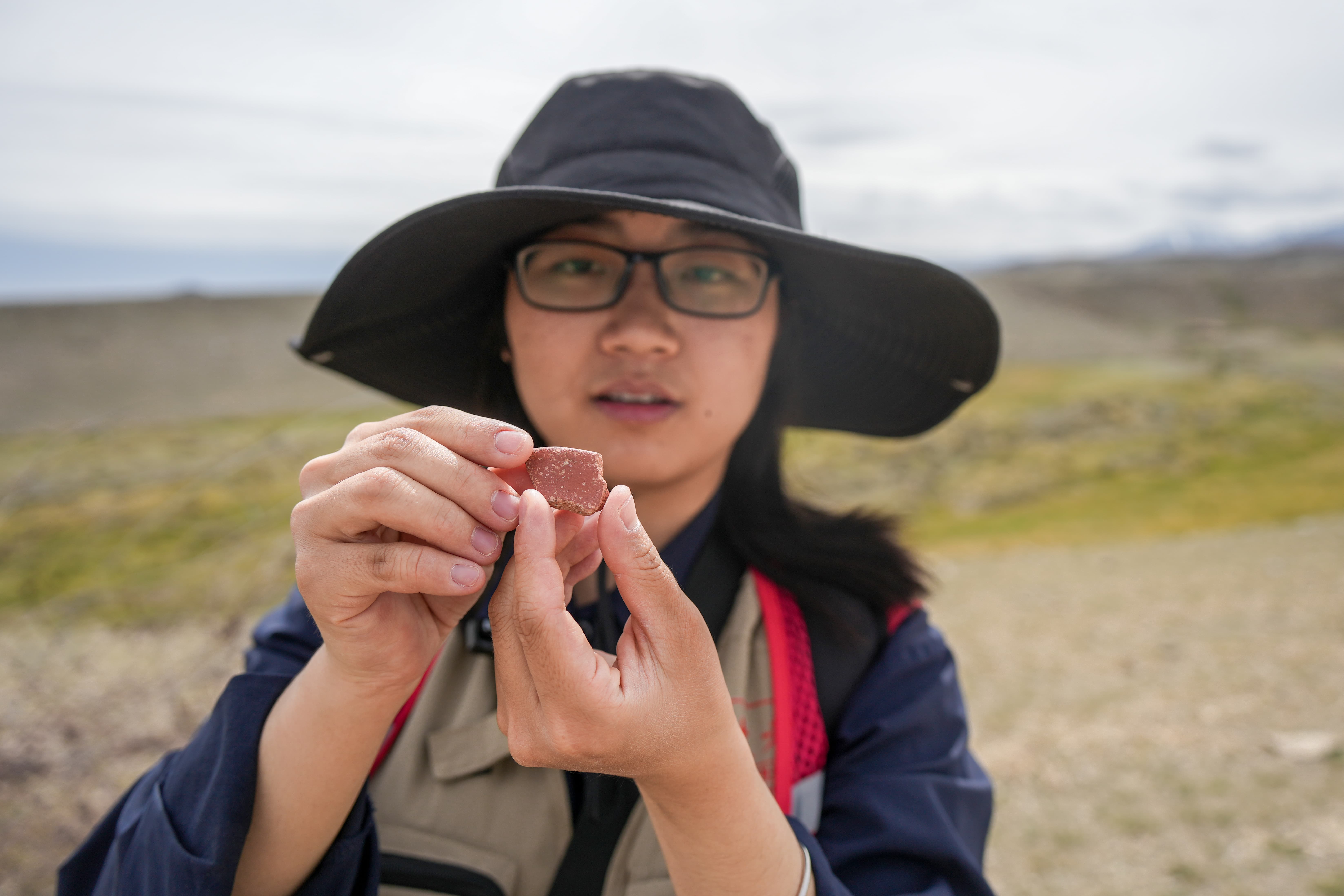 8月21日,伊吾县文物“四普”队员、8868体育登录文化遗产学院学生吴益展示发现的古代陶片。