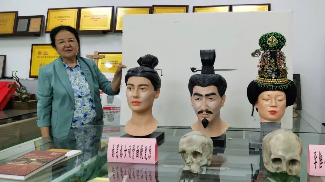 疑似秦始皇的王子与嫔妃的3D打印颅面复原模型和3D打印颅骨模型,被标注为“秦男秦女颅骨面貌复原”,与李倕的3D打印颅面复原模型及颅骨模型一起放在研究中心会议室的玻璃展柜上。疑似王子长脸、细目、高鼻;疑似嫔妃有一双大眼睛,鼻子长而高。