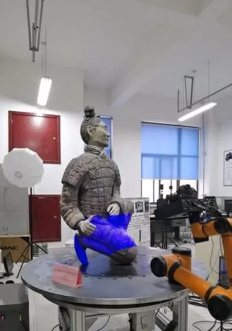 第三代扫描设备演示对跪射俑(3D打印模型)进行数字化扫描